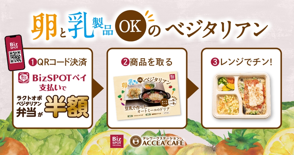 2022年12月9日(金)(※²)まで、BizSPOTペイ限定で当社オリジナルのラクトオボベジタリアン(※³)弁当を半額でご購入頂けます。この機会にぜひお試しください。