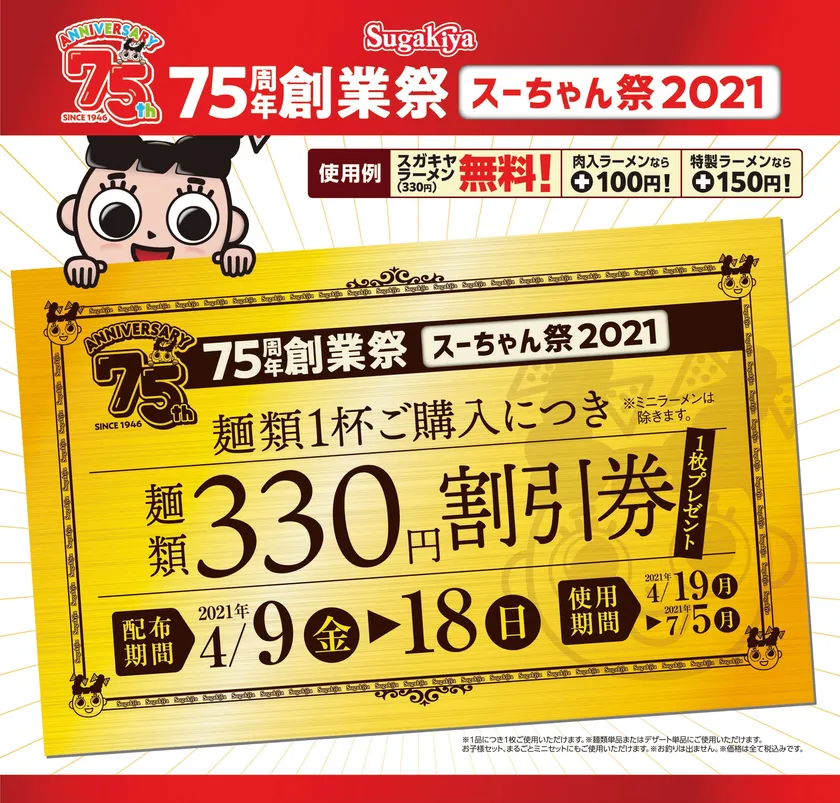スガキヤ「75周年創業祭」~スーちゃん祭2021~ 開催中! 店頭キャンペーンで4月18日まで麺類330円割引券プレゼント