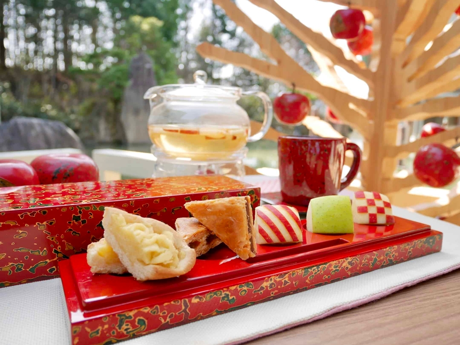 界 津軽の前に広がるりんご農園で採れた、その時期に旬を迎える品種を使ったりんごの食べ比べや、アップルティーを用意します。津軽の伝統工芸品「津軽塗」のお菓子箱にカットりんごを3種類と、ひと口サイズのりんごのスイーツを2種類詰めました。その時期によって甘味や酸味の異なる品種から、地元の人にもあまり知られていない希少品種まで味わうことができます。