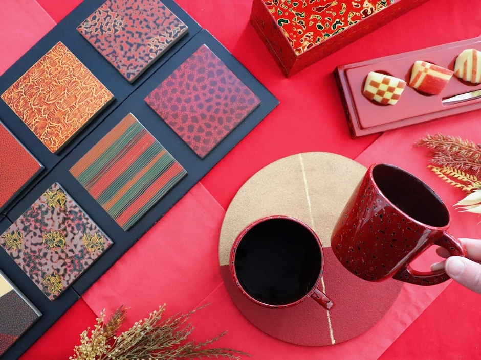 地元の若手作家と連携し、秋をテーマに津軽塗のカップ4種類とコースター12種類を用意します。津軽塗には様々な技法があり、作家によって色や技法が異なります。個性豊かな茶器の中から好きな組み合わせを選び、自分好みのオリジナルの茶器セットでお茶会を楽しむことができます。
