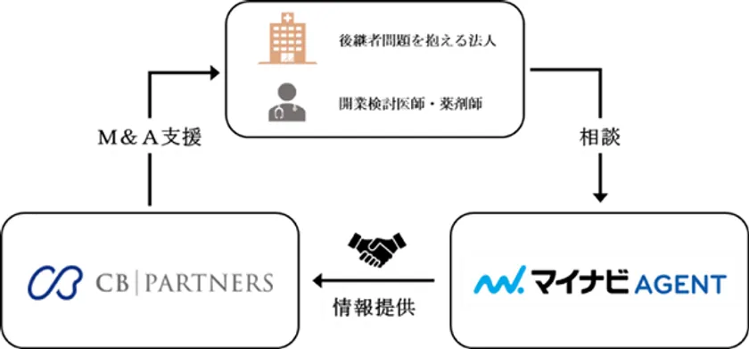 今回の提携先であるマイナビ社が運営する人材紹介事業『マイナビAGENT』は、一般企業のみならず、医療法人、調剤薬局をはじめとする医療・介護・福祉業界の人材紹介についても幅広い実績を有しており、現在も人材紹介サービスを提供する中で、顧客より事業承継や開業希望の相談を受けています。本業務提携を通じ、『マイナビAGENT』が長年人材ビジネスで培ってきた経験と、CBパートナーズが保有する業界特化のM&A情報を活用することで、両社の顧客に対し、より幅広い後継者候補の紹介や事業承継の提案をするとともに、事業承継支援による地域医療存続のための「後継者問題」の解決を図ってまいります。