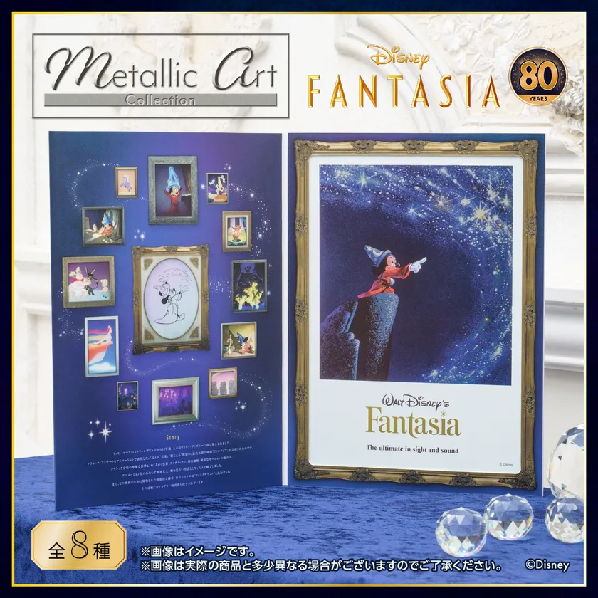 メタルポスターは、魔法使いの弟子の姿となったミッキーマウスをメインに、映画公開当時のポスターアートや、劇中シーンをイメージしたデザインなど、『ファンタジア』の世界を感じる煌びやかなデザインで全8種類をラインナップ。