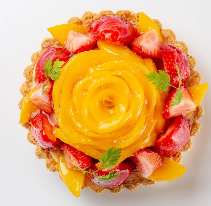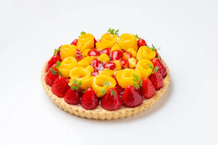 果物の美味しさをより引き立てる当社オリジナルのクリームと、華やかな甘いマンゴーと可愛らしい赤いいちごの酸味が絶妙なタルトです。