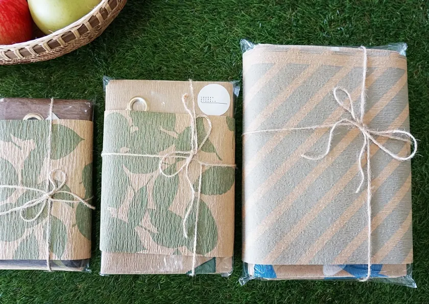 クラフト古紙を使用したレジャーシート(ブランド名:crep)。通常のポリエチレン素材のシートと比べて、プラスチック使用量を150分の1に抑えることができます。サイズはS(60x90cm)、M(90x135cm)、L(110x200cm)の3種類。紙製なので軽く、コンパクトに折りたためます。