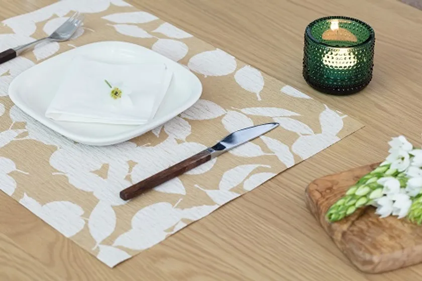 再生紙でできたランチョンマット。華やかな柄がテーブルを彩り、クレープ紙特有の凹凸が食器を優しく受け止めます。
