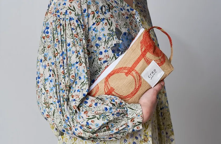 再生紙でできたポーチ。とっても軽く、さらさらの肌触り。お出かけ時の小物入れや化粧ポーチにおすすめです。