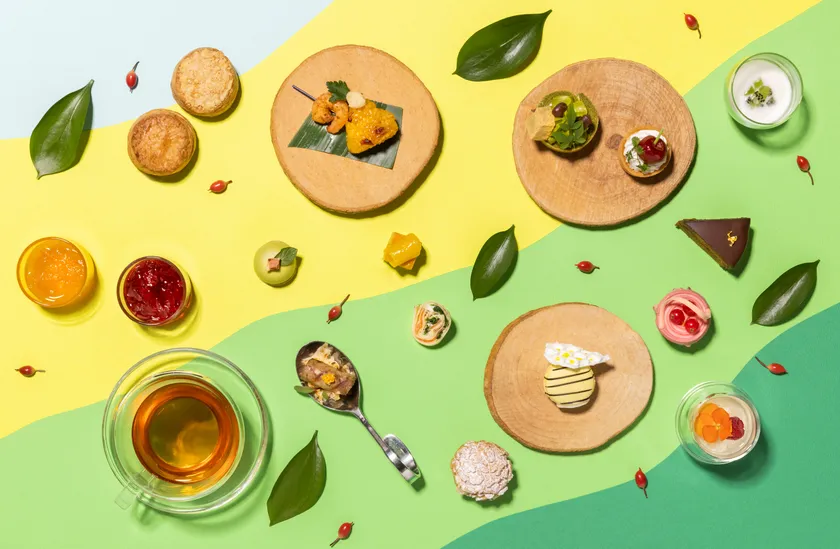 初夏の陽気が漂う新緑の季節を楽しんでいただけるような、色鮮やかで可愛いスイーツ8種とセイボリー6種が、アフタヌーンティータイムを彩ります。初夏に旬を迎える食材や、さわやかな香りやスッキリとした味を堪能いただける素材を使用しているので、五感で季節を感じる優雅なティータイムをお過ごしいただけます。