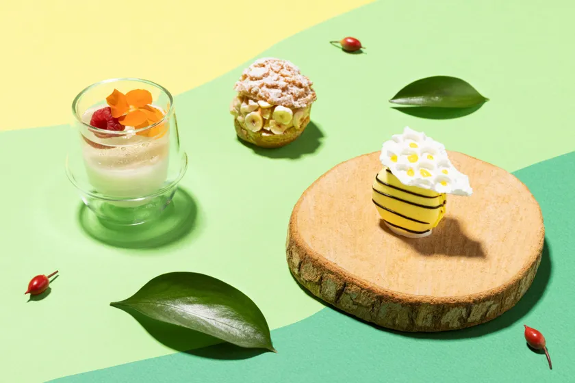 スイーツから、ピクニックバスケットをイメージした「ラズベリー&ライチムース」は、ライチピューレのムースを、ラズベリーフリーズドライ入りのパリっとしたストロベリーチョコレートでコーティングし、ラズベリームースで蓋をしました。チョコレートとフルーツの口溶けが甘酸っぱいスッキリとしたデザートです。まるでハチの巣のようなメレンゲが一際目立つ「ハチミツとホワイトチョコマカロン」は、ハチミツとレモンの甘酸っぱいバタークリームとコクのあるホワイトチョコレートをサンド。メレンゲにハチミツに見立てたゼリーをデコレーションした美しいマカロンです。