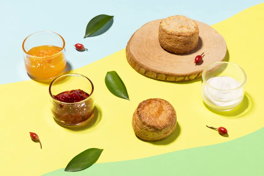 スコーンの中にも表面にもパルメザンチーズをふんだんに使用した香り豊かなオリーブオイル&パルメザンチーズスコーンをご用意。コンディメントはクレームドゥーブルのほか、びわをレモン汁とノンアルコール白ワインで煮詰めたさっぱりとした「びわ&白ワインジャム」、ローズペタルを煮出してバラの花びらと一緒にゼリー状にした香り高い「ローズジャム」の2種をお楽しみいただけます。