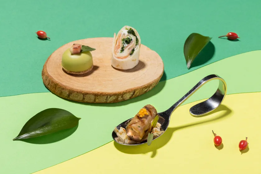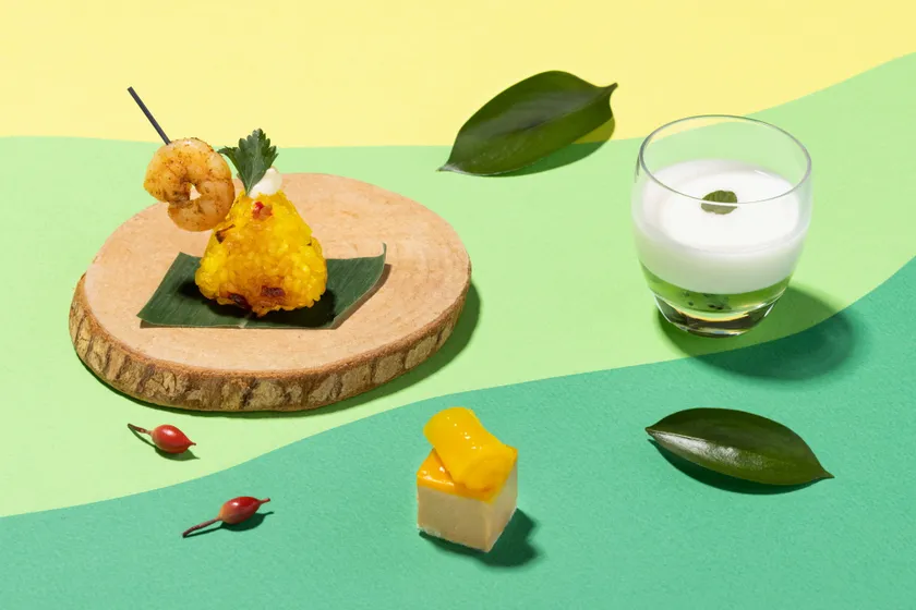 セイボリーから、春から初夏にかけて旬を迎えるグリーンピースを使用した「グリーンピースのムースとミント 焦がしバターのクッキー」は、ほのかな甘みが特徴のグリーンピースをムースにし、焦がしバターが香るクッキーと合わせました。ムースの香りや味に深みがでるよう、アクセントにベーコンとミントをのせています。デザート感覚で楽しめる「ミント香る キウイと甘酒のラッシー」は、フレッシュなキウイの果肉が入ったキウイゼリーに、米麹から作られた甘酒を使用したラッシーを注ぎました。冷たいうちにスプーンでほぐしてからつるっと召し上がってください。