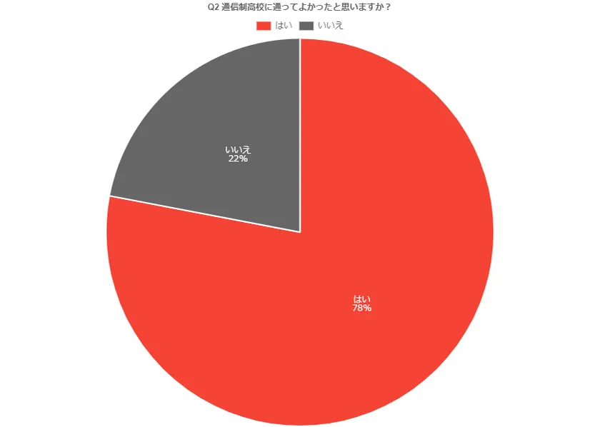 そこで、通信制高校の卒業者150人に対し、『通信制高校に通ってよかったと思っているか』質問をしたところ、78%もの方が通ってよかったと考えていることが明らかになりました。