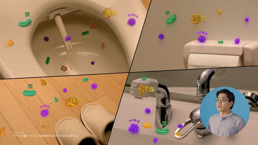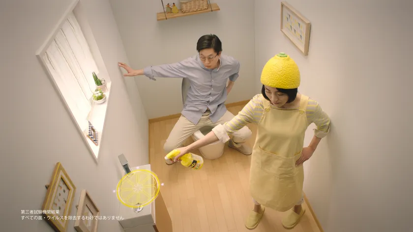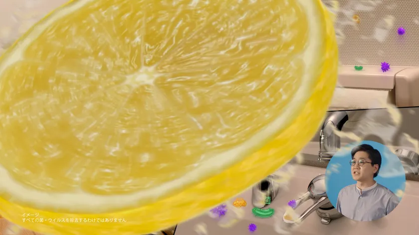 トイレ中がレモンのモチーフで洗い流され、菌やウイルス、汚れが綺麗に取り除かれ、さらには除菌もされていく。ウルトラレモンクリーナーで綺麗になったトイレは、まるでレモン畑にいるような…と、突然トイレの壁が倒れ、まさにレモン畑の中に佇むトイレが現れる。