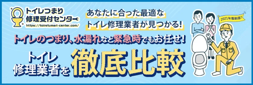 水回り修理業者の杜撰な修理や高額請求など、近年悪質な水道業者によるトラブルが多発しています。「トイレつまり修理受付センター」は、消費者の方が焦らず手間も時間も掛けずに、安心して依頼できる水道業者を選ぶことができる、水道業者マッチングのプラットフォームです。運営会社の厳しい審査を通過した優良な水道業者だけを掲載しています。さらに、独自のアルゴリズムで評価した水道業者ランキングや、水道業者の口コミや料金による業者比較などスムーズに自分に合った優良業者を選べるコンテンツはもちろん、「専門家直伝の業者を選ぶコツ」に「自分でできる!トイレつまりの直し方」などためになるコンテンツまでお客様が知りたい情報を網羅しています。