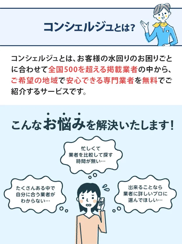 新機能の「コンシェルジュ」機能は、お客様の水回りのお困りごとに合わせて全国500を超える掲載業者の中からご希望の地域で安心できる専門業者を無料でご紹介するサービスです。コンシェルジュ機能は、「忙しくて業者を比較して探す時間がない」「たくさんある中で自分に合う業者がわからない」「出来ることなら業者に詳しいプロに選んで欲しい」というユーザーの声に応える形で追加されました。水道修理コンシェルジュにトラブル内容をお伝えするだけで、最短5分でお客様の希望通りのオススメ水道業者をご紹介します。