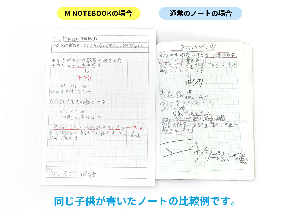 一生懸命に授業内容をノートに書き込んでいるけれど、その日に習う単元や課題、授業内容を書くスペースがうまくとれず、ノートがスッキリ見えないと感じている子供たちや親御様の気持ちにお答えし、どこに書けばいいのかを分かりやすく、さらに、まとめやすい学習ノート「M NOTEBOOK A4」を発売しました。