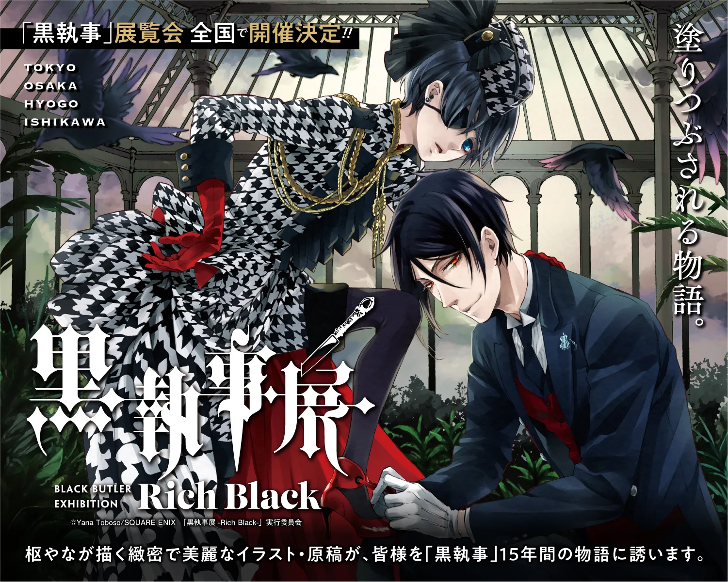 本展は、テーマカラーの「Rich Black(黒に様々な色を重ね合わせてつくる、黒よりも深い黒)」を基調に、主人公セバスチャンとシエルの物語を辿る展覧会となっております。枢やな自筆の美しいイラストや、「赤執事編」「サーカス編」「豪華客船編」などの人気エピソードから最新の「青の追憶編」まで数々の名シーンを振り返る連載原稿の原画を展示します。『黒執事』の壮大かつ緻密で美しい世界観をご堪能ください。