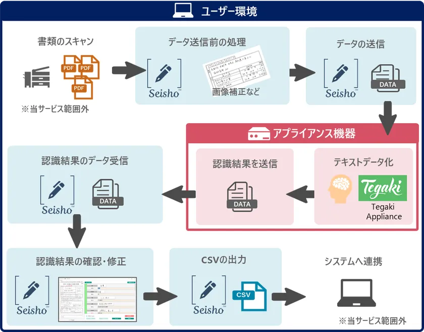 本サービスは、株式会社Cogent Labs(代表取締役社長CEO:エリック・秀幸・ホワイトウェイ、以下「Cogent Labs」)が提供する、AI技術を活用した高精度の認識率を誇るAI OCRサービス「Tegaki」のアプライアンス向けエンジン「Tegaki Appliance」をインストールした専用のアプライアンス機器と、京都電子計算の「Seisho」を組み合わせて提供します。