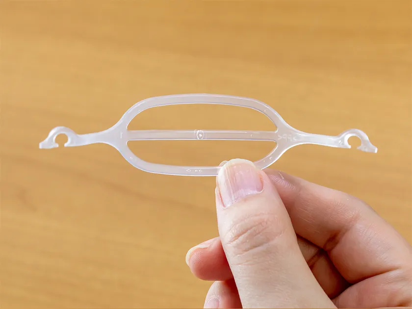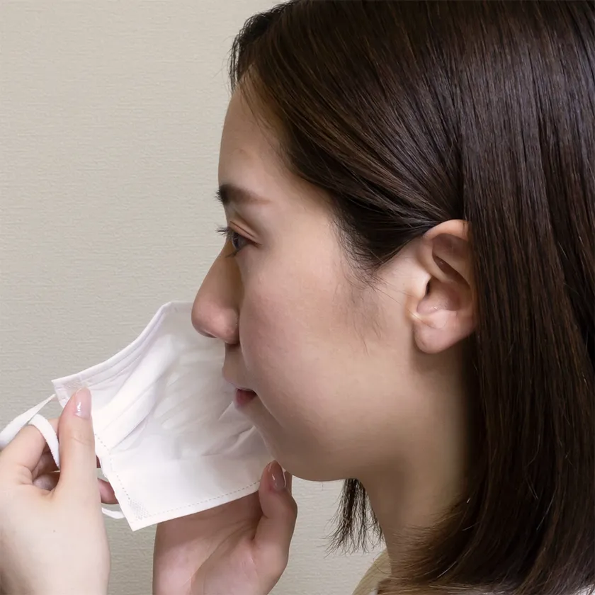 本品は不織布マスクの内側に装着することで立体的な形状をつくり出し、口の間に空間をつくり、呼吸を楽にするとともに話すことも楽にします。メガネが曇りにくく、化粧落ち、化粧かぶれも軽減。マスク生活における様々な問題の解決が期待されます。