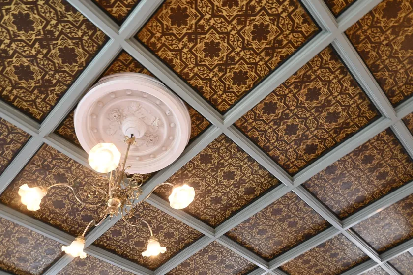 格天井に施された金唐革紙(きんからかわかみ)(2階)