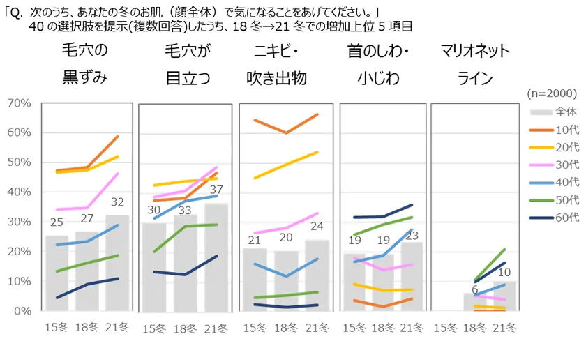 18冬→21冬で増加が大きかった肌悩み上位5項目は、「毛穴の黒ずみ」「毛穴が目立つ」「ニキビ・吹き出物」「首のしわ・小じわ」「マリオネットライン」で、4~5ポイント増加した。