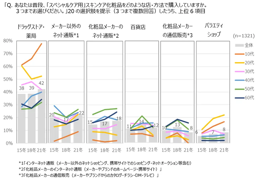 「スペシャルケア用」の購入先は「ドラッグストア」が42%、「メーカー以外のネット通販」「化粧品メーカーのネット通販」の順。「ドラッグストア」「バラエティショップ」は15冬→21冬で増加。