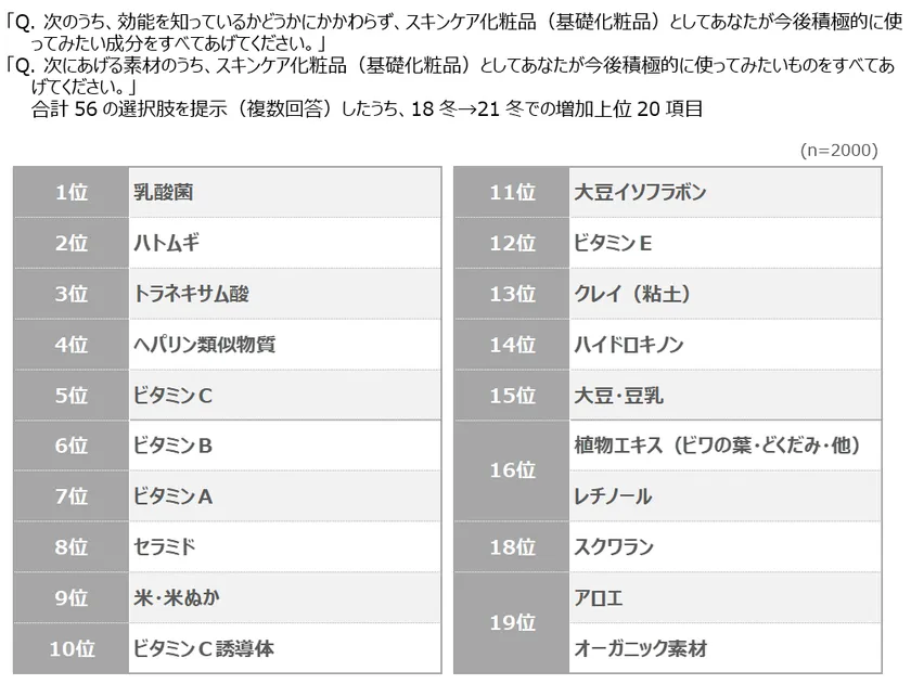 ◆18冬→21冬で使用意向が増えたスキンケア化粧品の成分・素材は、「乳酸菌」「ハトムギ」「トラネキサム酸」「へパリン類似物質」「ビタミンC」の順で、いずれも6ポイント以上の増加。