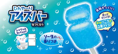 冷蔵庫で冷やすとひんやりした触感を楽しめる、アイスバーを作ることが出来ます。アイスバーのもとなど3種類の材料を混ぜて、バニラ部分とソーダ部分を作って組み合わせると、ソーダの香り付き2層アイスの出来上がり。