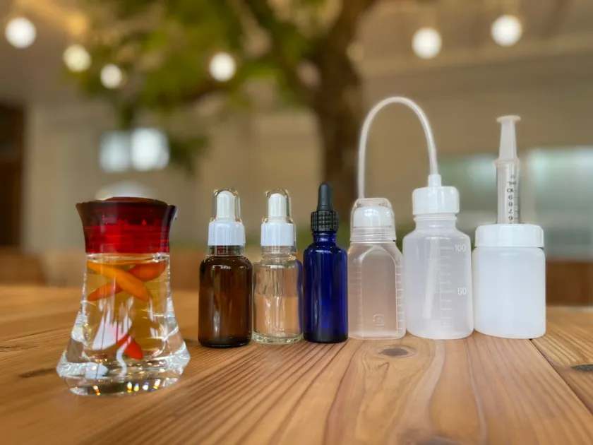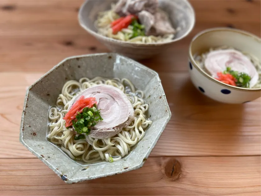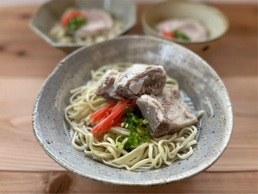 そんな沖縄伝統の古民家で、提供するのは、無化調にこだわった沖縄そば。「最後まで飲み干せるスープ」をコンセプトに、出汁のベースは、沖縄県産鶏、鹿児島県枕崎市の鰹節を使用。メニューは、「本ソーキそば」、「三枚肉そば」の2種類のみ。小さなお子様からご年配の方まで、幅広いお客様にお楽しみいただけるよう、大・中・小の3サイズをご用意しています。「三枚肉そば」は、税込で400円~、「本ソーキそば」は、税込で500円~とワインコインで手軽にお召し上がりいただけます。本ソーキと三枚肉は、沖縄産豚を使った自家製。お椀の中で、鰹節、鶏肉と豚肉が混ざり合い最高のスープに変化します。店主の上原がセレクトした、沖縄県内各地のやちむん(※4)でお出しします。また、沖縄そばには、欠かせない紅生姜とコーレーグース(※5)も自家製。テーブルごとに異なったコーレーグースの容器を並べ、遊び心を演出します。季節のお野菜を使った、主役のそばを邪魔しない、ジューシー(※6)とお稲荷もお楽しみいただけます。