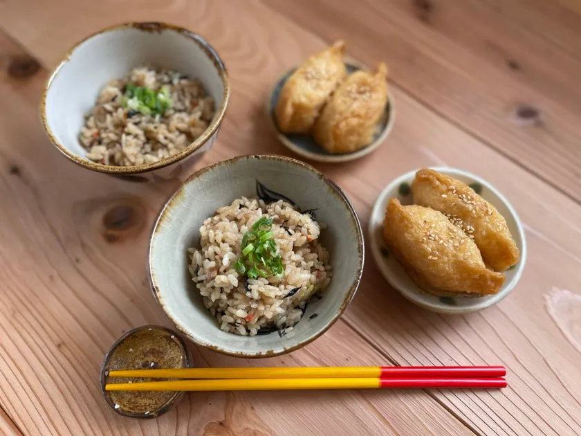 豚バラ肉と、ひじきやにんじんなどの野菜を具に、豚肉の茹で汁や昆布のだし汁で炊き込んだ沖縄風の炊き込みご飯。沖縄そばとのセットは沖縄県の食堂における定番メニューとして人気。