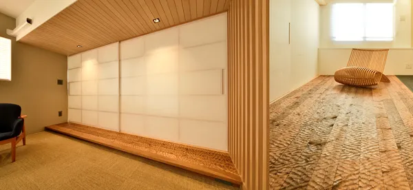 LDKにはサイザル(麻)を敷きつめ、和室は削り出しの板敷きとし、視覚・足触りに変化を感じさせます。太鼓貼りの大引き戸と少し天井高の低い鴨居でつながる空間は、ひとつながりの和風モダンのリビングとしても、大引き戸を閉じて小粋な茶室やアトリエ・客間としても、様々な使い方に変化します。