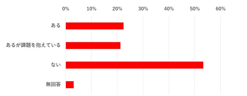 さらに、中小製造業において解決したい課題である「教育・研修」について調査を実施しました。回答結果によると、半数以上の企業が20~40代の若年層や中堅層における専門的な技術力の向上に課題を感じています。また、研修の実施状況については、実施していない企業が50%以上、実施しているものの課題を感じている企業が約20%で、「コロナの影響で実施のタイミングが合わない」「研修後のフォローができない」「社内の指導力不足」など、実施後の課題だけではなく、研修を実施する以前に様々なハードルを抱えていることがわかりました。