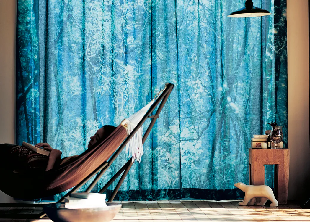 「爽やかで夏の清々しい緑を感じられるもの」というリクエストに対して、市橋さんが提案してくださったのがこの渓谷の写真で、澄んだ山の空気を感じる山間の別荘にいるような気分を味わえ、光の加減で見え方も変わる表情豊かなカーテンとなりました。