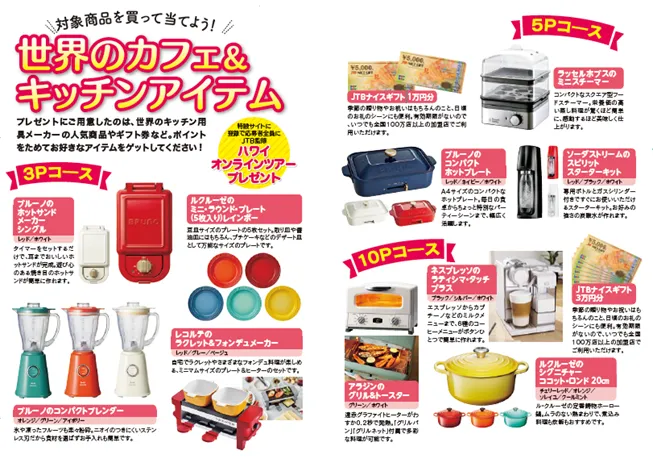 対象商品を購入し、キャンペーンサイトでご応募いただいた全員の方に「JTB監修 応募者限定オンライン ハワイツアー」、貯めたポイント数に応じてお選びいただく「世界のカフェ&キッチンアイテム」が抽選で合計330名様に当たるキャンペーン です。