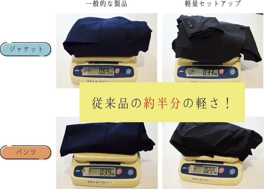 一般的なスーツ生地と同型で作成した製品の約53%の軽さです。