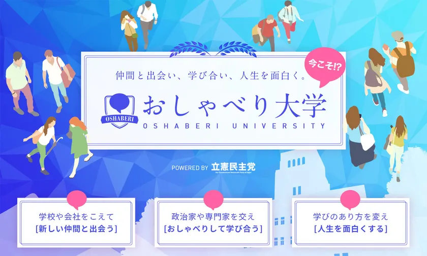 立憲民主党青年局は2021年度より、学生・若者がコロナ禍を乗りこえ仲間と出会い、学び合える新しいコミュニティ『おしゃべり大学』をスタートします。日本全国の“学びたい”若者がオンラインを中心に出会い、豊富な経験・専門性を持ったゲストや政治家たちとともに様々な社会テーマや政策を学び合うことで、一人ひとりの人生がより面白く豊かになることを目指す、オンラインの仮想大学的なコミュニティを目指していきます。