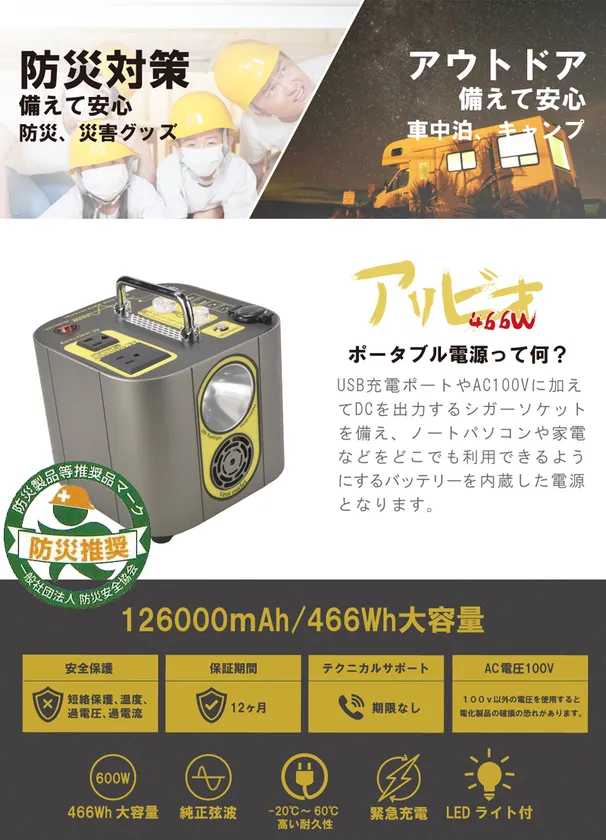 Cyberplugs、防災製品等推奨品認証済 多用途ポータブル電源「アリビオ466w」を販売開始 ~防災対策やアウトドアに備えて安心!小型軽量で大容量~