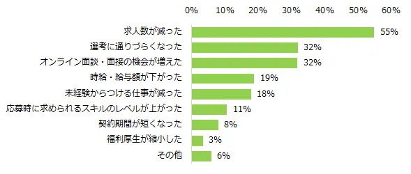 「バイト探しにおいて、新型コロナウイルスの影響を感じますか?」と伺ったところ、75%が「感じる」と回答しました。どのような影響があったかを伺ったところ、 半数以上の方が「求人数が減った」(55%)と回答。次いで、「選考に通りづらくなった」(32%)、「オンライン面談・面接の機会が増えた」(32%)が続きました。