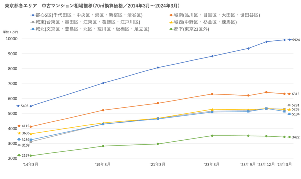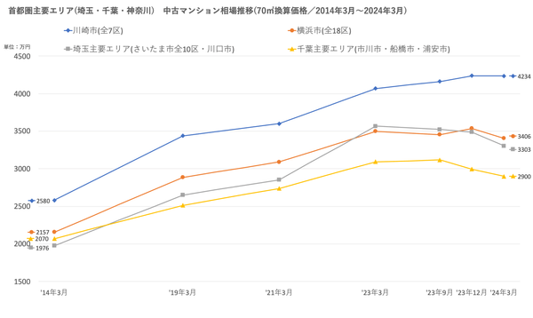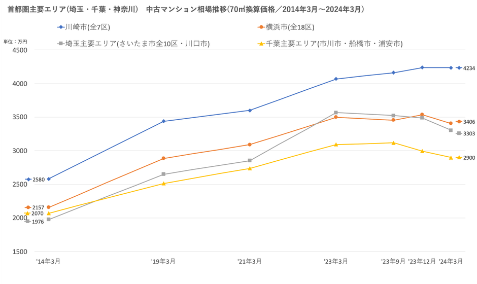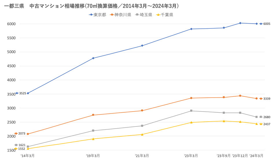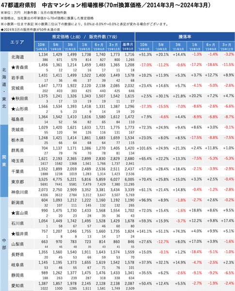 「不動産×WEB×ビッグデータ」の領域で、さまざまな不動産テックサービスを展開する株式会社ワンノブアカインド(本社:東京都港区、代表取締役社長:川島 直也、以下当社)は、当社が運営しているマンション情報サイト「マンションレビュー」の保有データを元に、全国の2024年3月の中古マンション相場を調査。坪単価をベースに70㎡での価格に換算した「中古マンション価格」*1について、10年前・5年前・3年前・前年からの推移を都道府県別・エリアごとにまとめましたので、発表いたします。