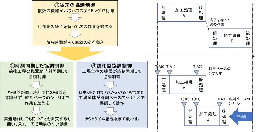 近年、ロボットによる作業の無人化、無人搬送車やドローンによる運搬作業の無人化、多数のセンサやカメラのデータを用いた予知保全など機器どうしをネットワークでつないだシステムが増えています。スムーズな動作や正確な予知を実現するためには、各機器の時刻が同期し、同じタイミングのデータ取得や制御のための時刻同期機能が必要となり、産業分野、自動車分野では時刻同期を実現するネットワークとしてEthernet TSNが注目されています。Ethernet TSNの時刻同期機能は、基準時刻を提供する時刻サーバを各機器が参照すること、各機器をEthernetでつなぐことで実現されていますが、この条件に合わないシステム(例:Wi-FiやCANなどEthernet以外の通信が混在するシステムや時刻サーバ無しでも時刻同期が必要となるシステム)でも時刻同期を実現可能とするために、今回リリースする調和型時刻同期機能を開発しました。本機能は、協調制御システムを構成する各機器が同一時刻の制御入力をもちいて、同一時刻、同一周期で制御できるシステム全体が調和した調和型協調制御を実現し、正確な協調動作によるタクトタイム短縮可能なロボットシステム、同一時刻データに基づく正確な予知保全システムなどお客様の製品力強化に貢献します。