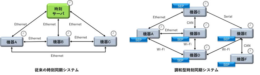 現在普及している時刻同期機能は、各機器をEthernetでつなぐことで実現していますが、本機能ではEthernet、Wi-Fi、Serial、CANなど様々なネットワークが混在したシステムにも適用できます。
