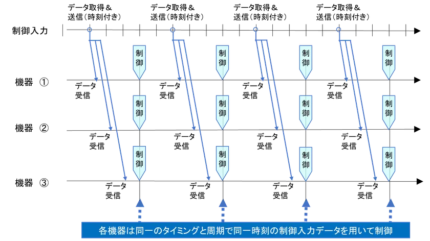 今回リリースする調和型時刻同期機能を用いた協調制御では、機器間で精度が一番高い機器に時刻を合わせることで、システム全体のタイミングが一致した協調制御を行うことができます。さらに、特長5の時刻同期型データ共有機能と組み合わせることで、協調制御システムの各機器が同一時刻の制御入力をもちいて、同一時刻、同一周期で制御できるシステム全体が調和した調和型協調制御システムを実現することができます。