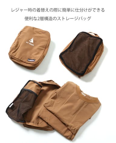 レディース商品は、Tシャツ型のトップス、ウエストが総ゴムでゆったりシルエットのガウチョパンツのセットアップ。それぞれ、持ち運びに便利で使い勝手の良いストレージバック付の3点セット。