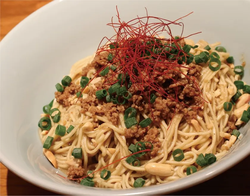 花椒の心地よい痺れと胡麻の香りが特徴の汁なし担々麺。豚の旨味とこだわりの肉味噌でマイルドな辛さに仕上げました。付属のラー油で辛さの調整もできます。汁なしのため麺も伸びにくくお酒によく合う一杯です。