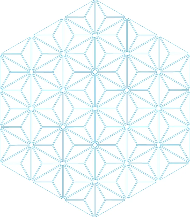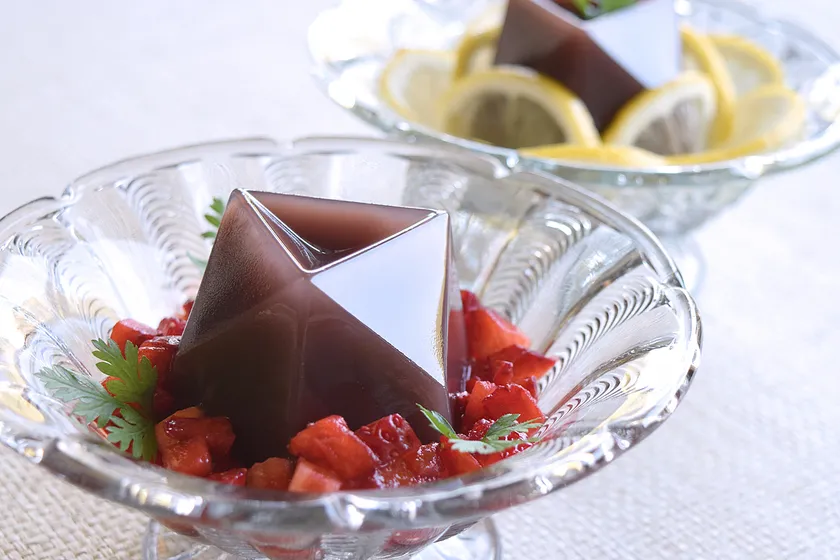 水羊羹で使用する天然糸寒天は、凍らせて溶かし、乾燥させることを繰り返してつくられます。凍った氷の結晶からのインスピレーションで、古典柄「麻の葉」をモチーフとし形状を構築しました。さらに、麻の葉柄には無病息災、長生きといった願いが込められているとされています。コロナ禍の中、そうした願いと伝統美をベースに、光と影によって様々な色合いを見せるシャープで美しい意匠に仕上げました。