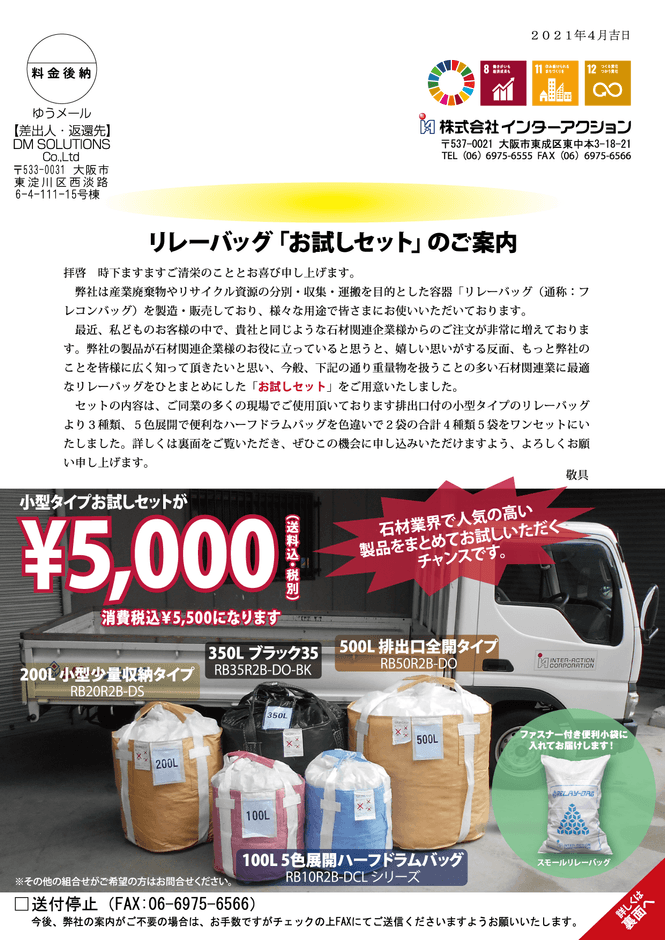 ■株式会社インターアクションでは「リサイクル物流をサポート」をテーマに、リサイクル資源の分別・収集・運搬容器「リレーバッグ(通称:フレコンバッグ)」の企画・製造・販売を行っています。