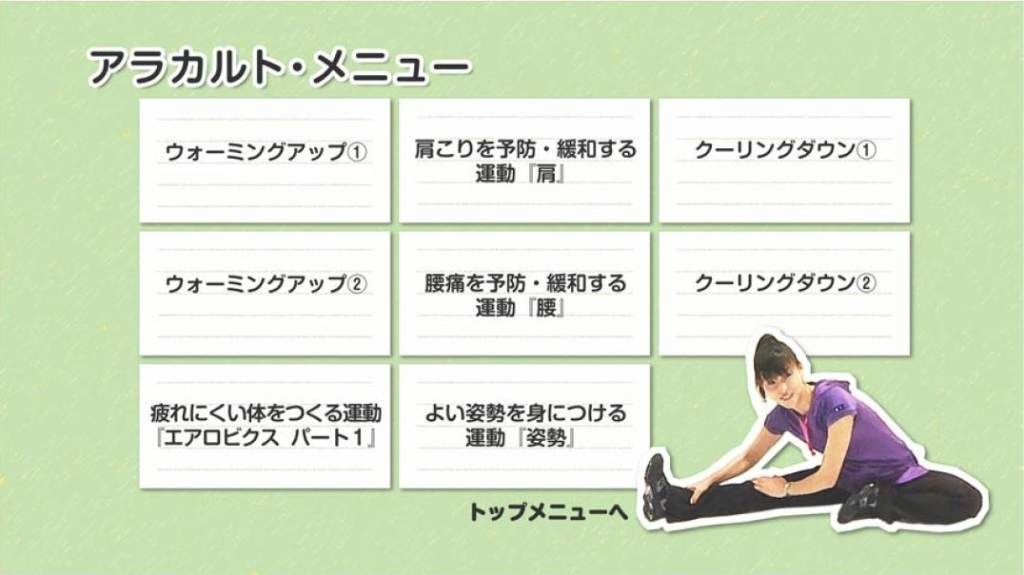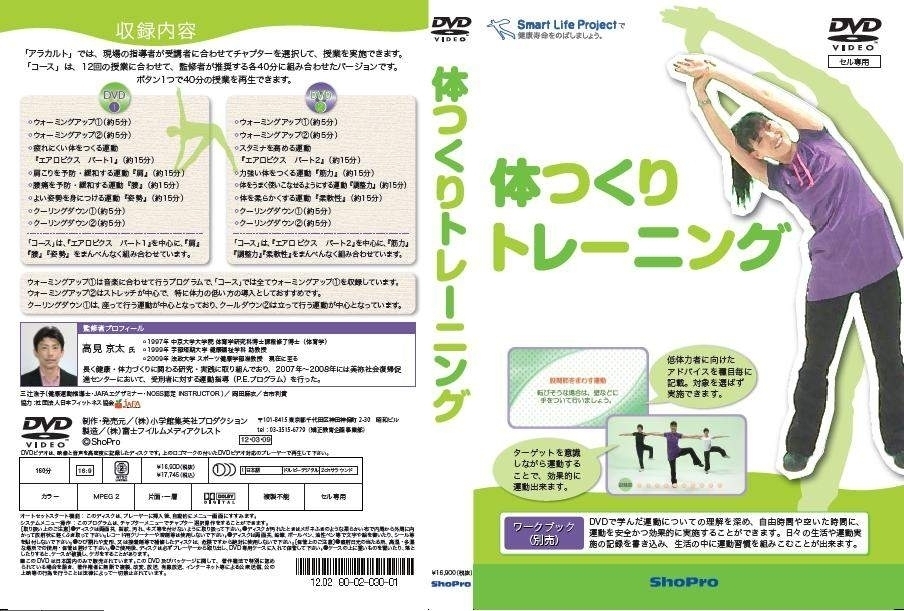 DVDでは、ウォーミングアップ2種類(各5分)と、クーリングダウン2種類(各5分)、『筋力』『柔軟性』といった主な体力要素や、現代人の悩みの種となりやすい『肩こり』『腰痛』等に効く全8種類の主運動(各15分)を収録し、受講者に合わせて指導者が内容を選択できる『アラカルト』と、40分×12回の授業に合わせたコースを用意しています。
