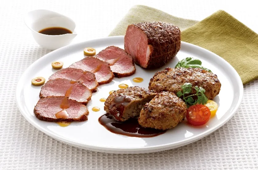 北海道産牛のモモ肉をスパイスと赤ワインにじっくり漬け込みしっかり味をなじませたローストビーフと、北海道産牛100%のビーフハンバーグのセットです。低温真空調理でじっくりと柔らかく仕上げました。