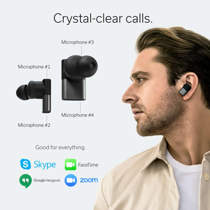 片耳2つ×両耳で合計4つのマイクを内蔵しています。この4つのマイクの1つは通話する為のマイクを兼用しますが、全てのマイクから集めた周辺の雑音は、優秀なチップにてノイズをリダクション(掻き消し)して、街中の雑踏の中でもコンサートホールのような静けさを再現。ノイズのない環境を作ります。AirPods Proをはじめとした多くのANC・ENC(ノイズキャンセル)イヤフォンは2つのマイクで雑音を収音している中でBETWEEN PROは4つのマイクで全方位のノイズを広い、掻き消します。これは通話時にも有効で自分はもとより、通話先の相手にあなたの声を的確に、リアルに届けます。Skype/Facetime/Google Hangouts(meets)など、オンライン会議でも自身・通話先の相手に対しどちらにもストレスフリーな会話を楽しめます。