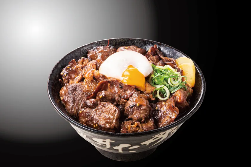 『特選W牛焼肉丼』は、ニンニク醤油をベースに隠し味として味噌やごま油を加えた特製の漬け込みダレにじっくりと漬け込んだハラミ肉と大きめにカットしたジューシーなカルビ肉を香ばしく焼き上げ、具材の玉ねぎとともに刻み玉ねぎの食感とニンニクのパンチが特徴の特製すたみな焼肉ダレで炒め上げ、茶わん約3倍分の大盛りご飯の上に盛り付けた丼です。