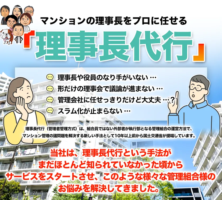 管理不全マンションの将来的な増加が大きな社会問題として認識されるようになってきたことで、その究極の解決法とされる『理事長代行(マンション管理組合の理事長を外部の第三者に委託する方法)』や『役員代行(既存の理事会の役員に外部専門家が就任)』に関するお問い合せが昨年から急増しています。それら全てに可能な限りお応えすべく、当社では、マンション管理士の増員、業務効率化といったさまざまな改革を進めてまいりました。